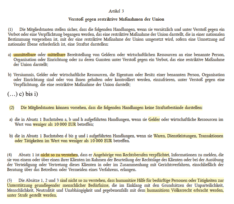 Die EU Rechtsakte (GASP) 2024/2643 und (EU) 2024/2642 entfalten ihre Sprengkraft aber erst durch ihren Einsatz im Inneren mit der Richtlinie EU 2024/1226, die die Umsetzung der Sanktionen ins deutsche Strafrecht (entsprechend in allen EU Mitgliedsstaaten) verlangt. Mit Gesetzentwurf 21/2508 vom 3.11.25 kam die Bundesregierung diesem EU-Diktat nach und Bundestag/Bundesrat haben das am 15.1.2026 gegen die Widerstände der betroffenen Wirtschaftsbeteiligten abgenickt. Zuvor galt die EU-Verordnung auch ohne strafrechtliche Umsetzung in nationalstaatliches Recht, allein durch Behauptung und die Praxis der Justiz.