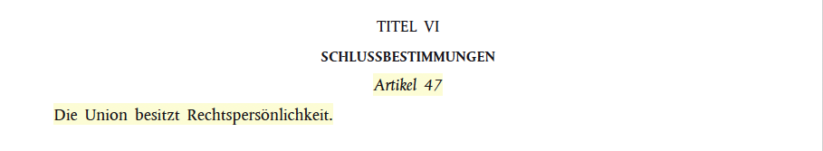 Die EU gibt vor, sich über nationales Staatsrecht zu erheben und maßt sich durch simples Postulat Gesetzgebungskompetenz an, siehe Art. 47 EUV (Vertrag über die EU (EUV)) und Art. 40 EUV ./. Art. 3-6 AEUV (Vertrag über die Arbeitsweise der EU (AEUV))