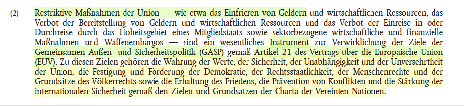Ziel der Strafrechtsharmonisierung des EU Sanktionsregimes ist – wie es der EU-Rechtsakt vorsieht – Rechtssicherheit. Dieses Ziel konterkariert die Deutsche Exekutive mit der willkürlichen Strafverfolgung durch die politische Justiz in völliger Ignoranz des Grundgesetzes und des internationalen Rechts und der Gesetze.