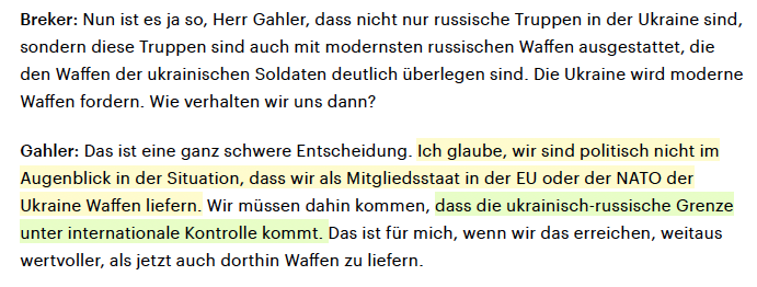 Gahler forderte nach dem US/NATO Putsch gegen die Ukraine härtere Sanktionen gegen Russland, Einreiseverbote und internationale Kontrolle der ukrainisch-russischen Grenze, Waffenlieferungen schließt er damals noch aus.